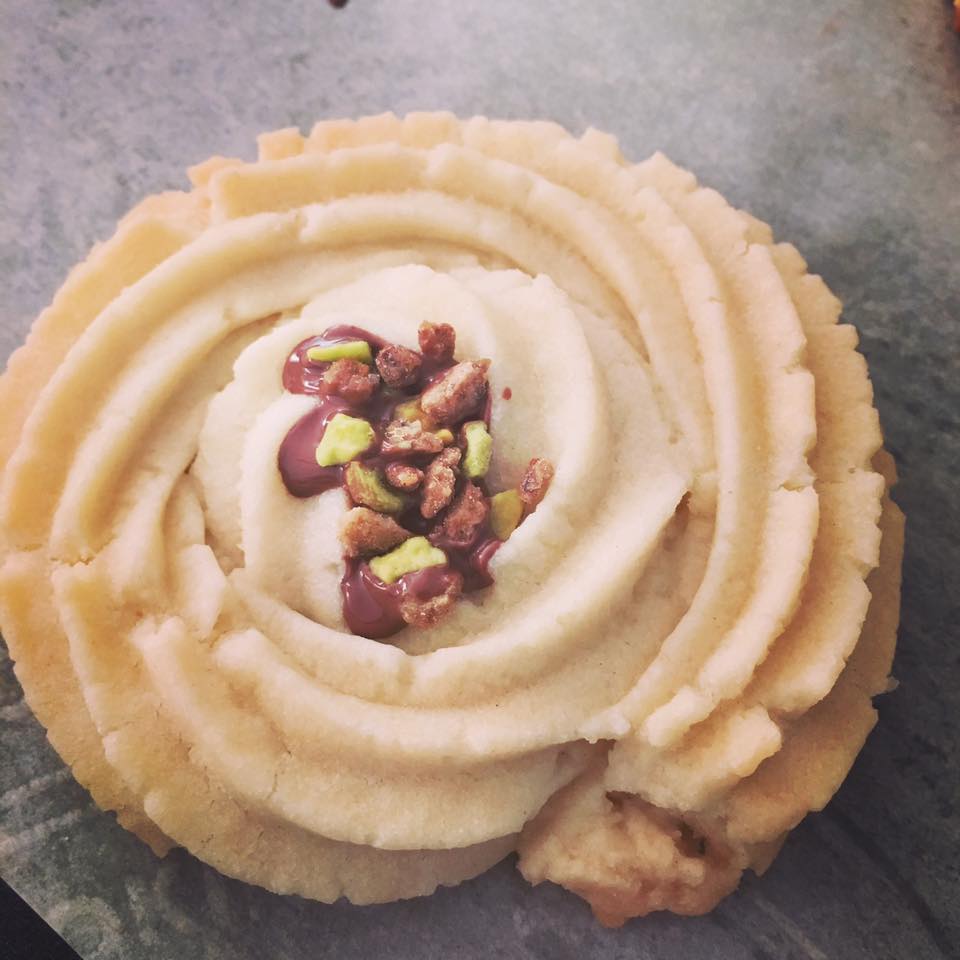 Tamiser la farine ainsi que la fécule de maïs sur le mélange de beurre. Mélanger jusqu’à obtenir une texture lisse.