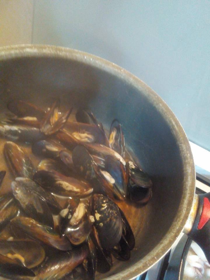 *a cĂ´tĂ© lavez vos moules et mettre dans une marmite arrosez les d’une louche d’eau et sur un feu doux pour quelques minutes .des qu’elles commencent a s’ouvrir retirez du feu.